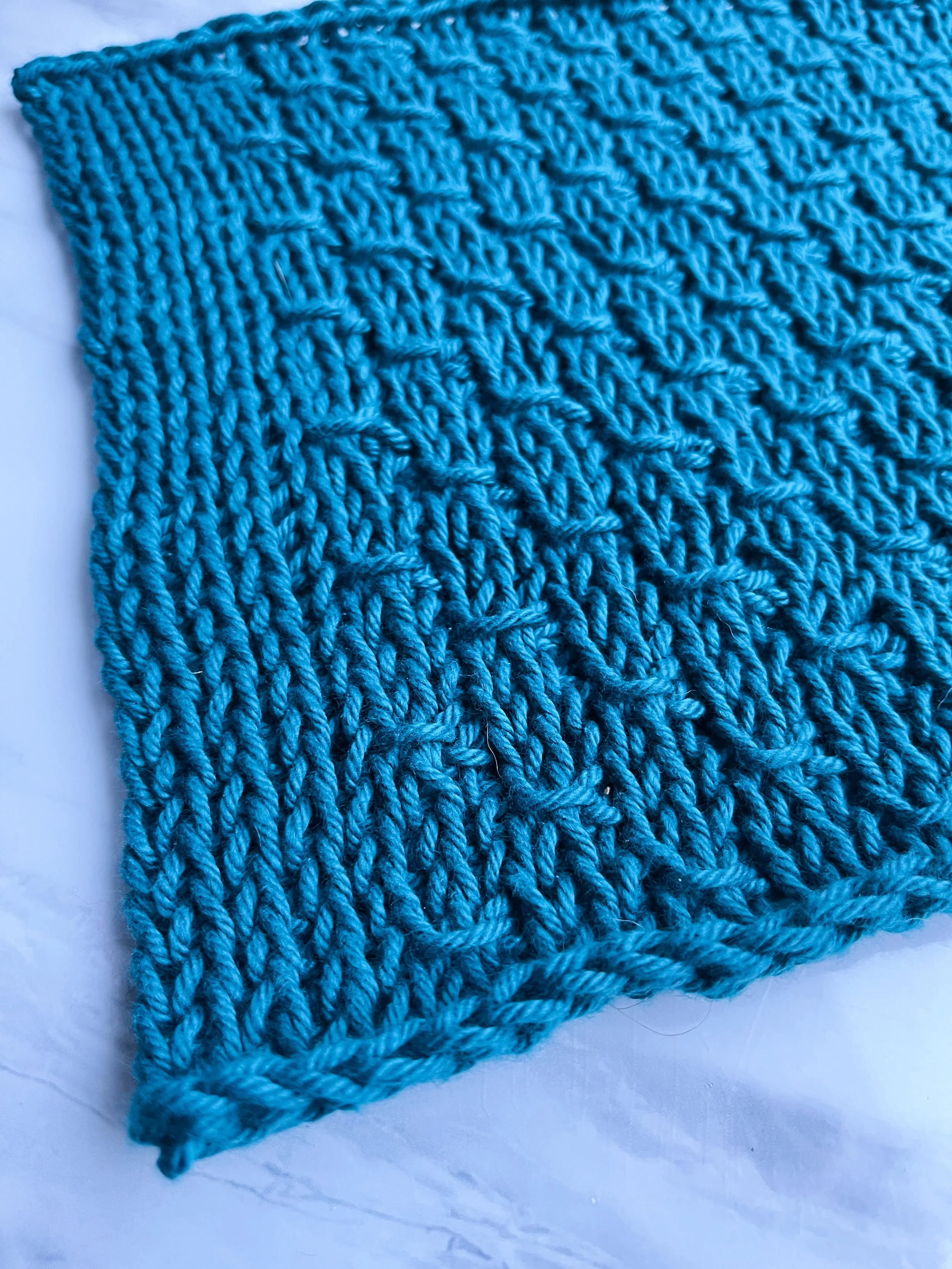 I’ve chosen dishcloths because they’re small enough to finish up quickly, but large enough to get a general idea of the fabric the stitch pattern will create!